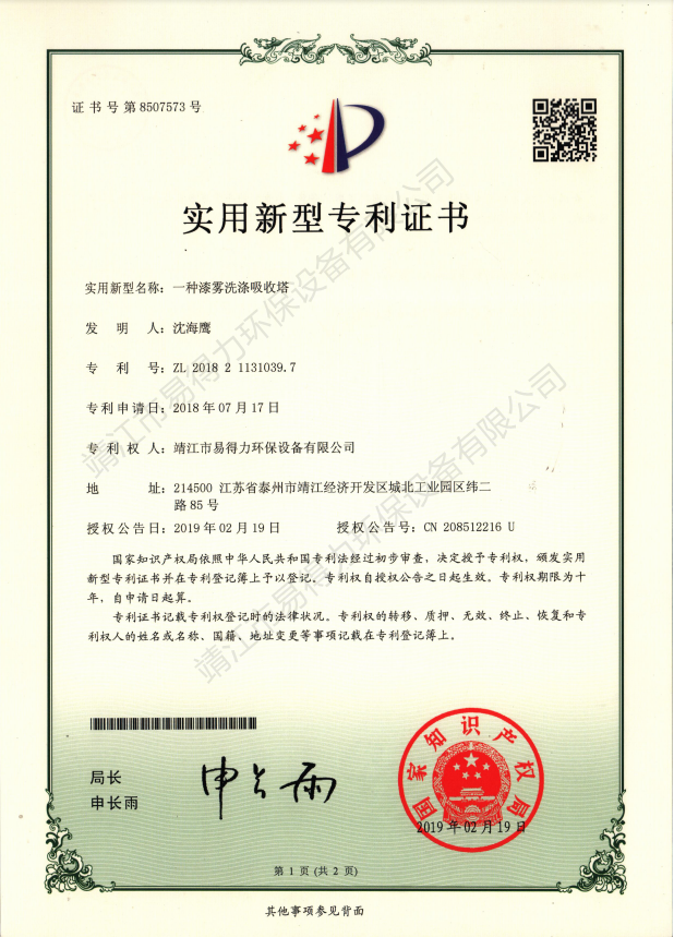 專利證書本公司坐落于開放開發(fā)超前城市江蘇靖江,我們精良優(yōu)秀設(shè)計(jì)團(tuán)隊(duì)始終遵循著創(chuàng)新超越的理念,贏得了中外合資企業(yè)的信賴。易得力環(huán)保設(shè)備有限公司與上海環(huán)科院等科研單位保持合作關(guān)系,不斷加大自身的科研力量,集中了一批國內(nèi)環(huán)境科技研究和應(yīng)用方面的高素質(zhì)人才,取得多項(xiàng)實(shí)用新型專利證書。…… 查看更多 >>